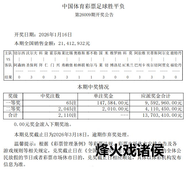 北京技艺1月16日,足彩第26009期开奖效能揭晓。本期足彩共开出65注,单注奖金147,584元;二等奖开出2045注2010元;任九开9408注1167元。本期赢输彩销量为21,412,932元,百家乐任九投注总和为17,160,302元。