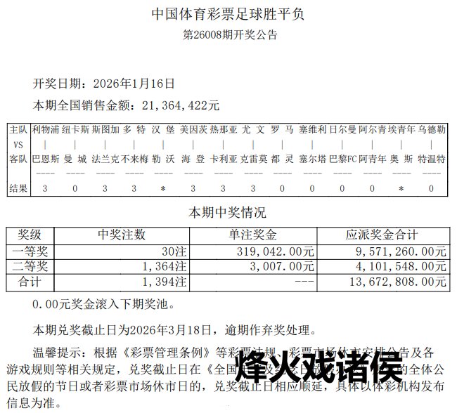 北京时分1月16日,赢输彩第26008期开奖效果揭晓。本期足彩头奖开出30注,单注奖金319,042元;二等奖开出1364注3007元;任九开2799注3779元。本期赢输彩销量为21,364,422元,PG电子官网任九投注总和为16,531,034元。