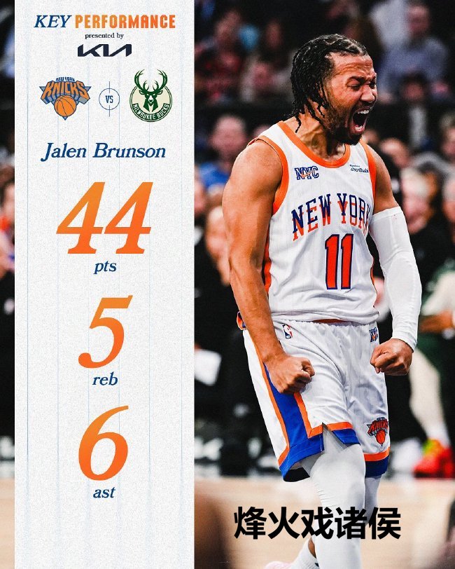 布伦森首节轰下23分,全场高效砍下44分率队赢球。唐斯16投10中砍下30分18篮板4助攻,尼克斯取胜后26胜14负稳居东部第三。